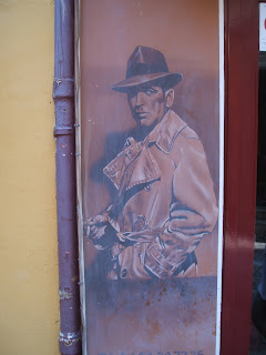 This was my first cruise for nineteen years – since before children arrived on the scene, that is. Cruising has changed in the interim – the ships are much bigger, the facilities much better, the food even more plentiful and fattening than before. For lazy travellers like me, it’s the ideal way to sample fresh parts of the world. And among the sunny spots I visited were Valletta (the signboard in the picture was the closest I camee to spotting the fabulous Falcon), Naples, Pompeii, Livorno, Pisa and its leaning tower, Tarquinia and Cannes. The Bogartesque artwork, by the way, comes from Cannes – not far from where some of the scenes of To Catch a Thief (which I covered in this blog recently) were filmed by Hitchcock.